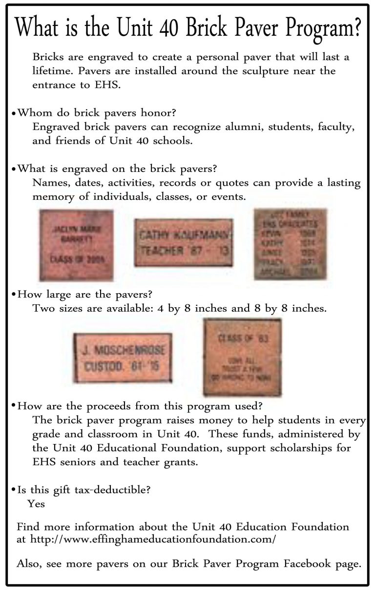 Celebrate a loved one, honor a student, or show your support for education with a personalized engraved brick. Your contribution helps fund scholarships and educational programs for Effingham Unit 40 students while leaving a permanent mark in our community.